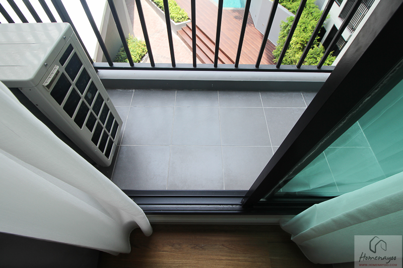 ราวกันตกเป็นระแนงเหล็กสีดำ พื้นที่ระเบียงมีมุมวางคอมเพลสเซอร์แอร์โดยจะมีระแนงเหล็กบังสายตาเพื่อความสวยงาม