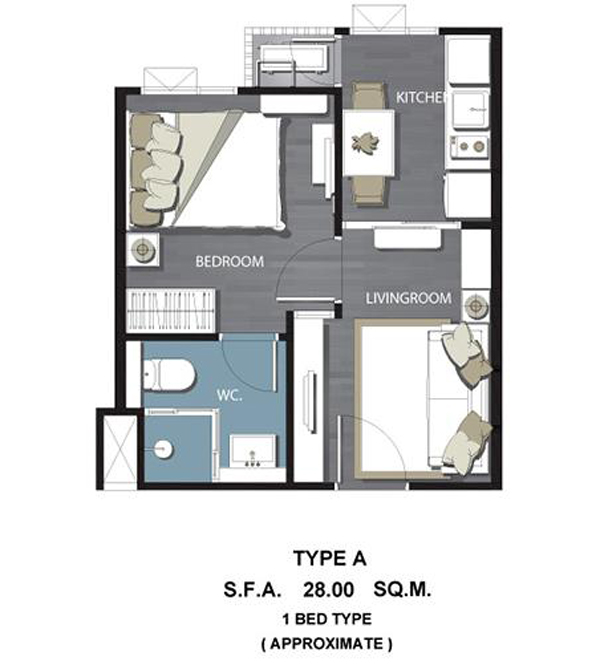 Type A : 1 ห้องนอน ขนาดพื้นที่ใช้สอย 28.0 ตร.ม. ราคาเริ่มต้น 1.79 ล้านบาท หรือ 63,930 บาท/ตร.ม.