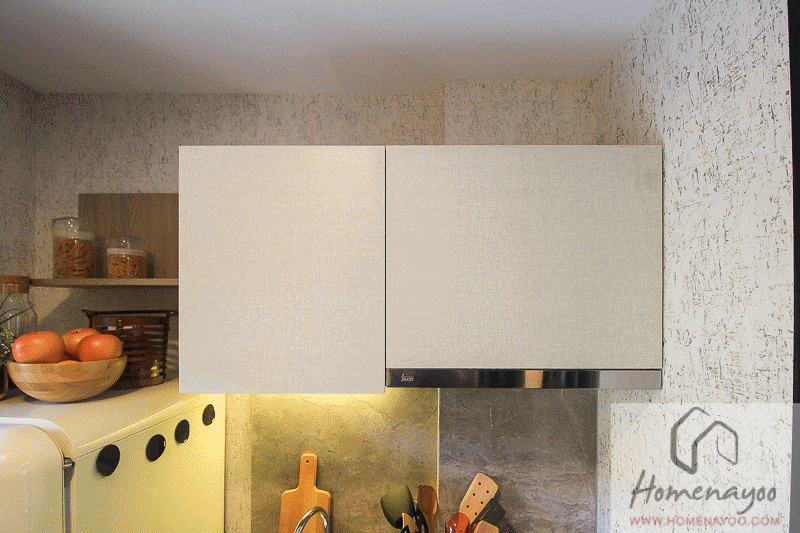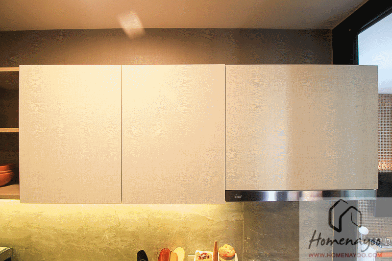 ส่วนเคาน์เตอร์ด้านบนจะแบ่งเป็นตู้บานเปิด 2 ตู้ และชั้นวางของด้านข้างอีก 2 ช่อง