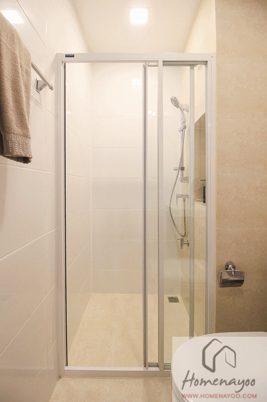 ห้องอาบน้ำจะติดตั้ง shower Box มาให้เช่นกัน เป็นประตูบานเลื่อน 3 ตอน กระจกนิรภัย