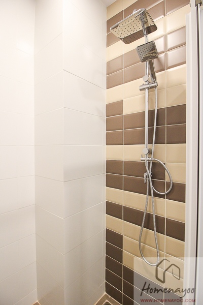 ส่วนของพื้นที่อาบน้ำโดยพื้นที่อาบน้ำจะกั้น Shower Box มาให้เป็นสัดเป็นส่วน โดยตัว Shower Box จะเป็นประตูบานเลื่อน 3 ตอน กระจกนิรภัยใส ช่วยกั้นแยกพื้นที่ส่วนแห้งและส่วนเปียกออกจากกันทำให้เวลาอาบน้ำ น้ำจะไม่กระเด็นออกมาเปียกพื้นที่ด้านนอก