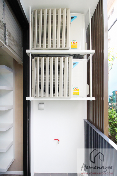 ราวกันตกเป็นเหล็กซี่ทำสีดำ พื้นที่ระเบียงมีติดก๊อกน้ำมาให้ 1 จุด และอกด้านก็มีกริลบังสายตาจากคอมเพรสเซอร์แอร์ติดมาให้ด้วย