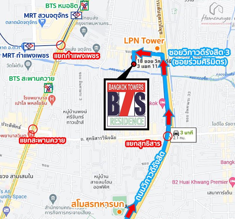 BTS RESIDENCE จาก บางกอก ทาวเวอร์ เรสซิเดนซ์ ตั้งอยู่บนถนนวิภาวดี-รังสิต ซอย 3 แขวงจอมพล เขตจตุจักร กทม. ใกล้รถไฟฟ้า MRT จตุจักร และ MRT หมอชิต ใกล้ Central ลาดพร้าว, Union Mall, JJ Mall, สวนจตุจักร และ รพ.เปาโล พหลโยธิน