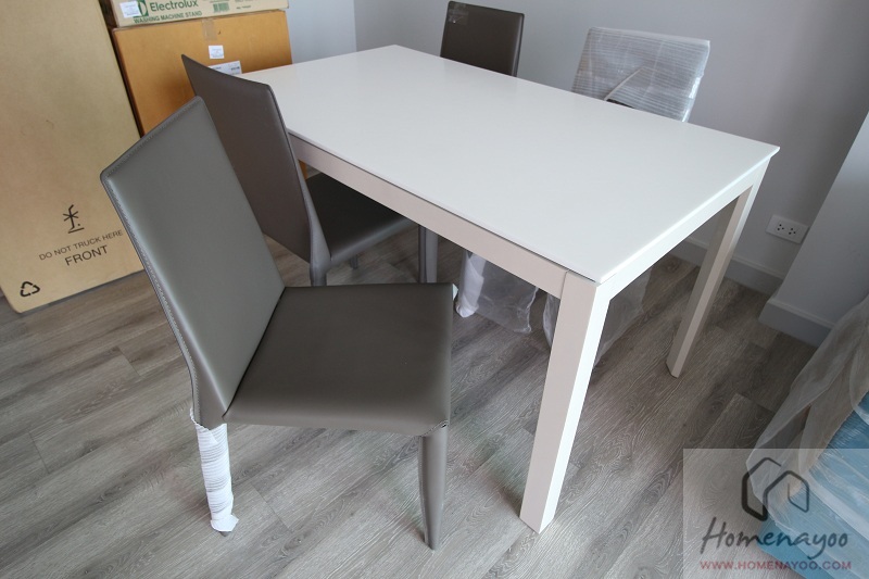 ในส่วนของห้องจริงนั้น จะได้เป็นโต๊ะทานข้าวแบบพับเก็บได้ เพื่อประหยัดพื้นที่ใช้งาน ถ้าไม่ได้นั่งทานข้าวจริงจังมากมาย ก็สามารถพับเก็บลงไปได้ ส่วนด้านในก็จะมีช่องเก็บของได้เล็กๆน้อย พร้อมเต้าเสียบปลั๊กไฟ 1 จุด เก้าอี้ที่ได้ก็จะเป็นเก้าอี้หนังเทียมสีครีม แบบมีพนักพิง จำนวน 2 ตัวค่ะ