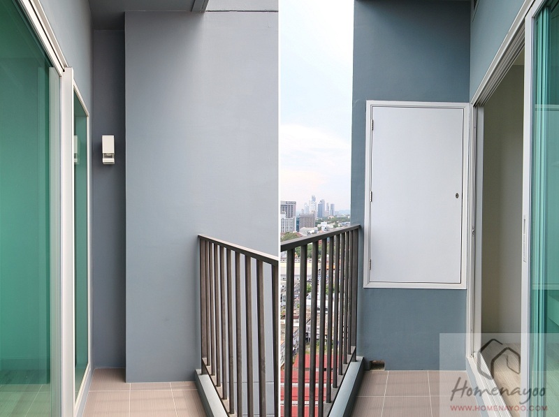 ระเบียงเป็นแบบหน้ากว้าง ปูพื้นกระเบื้องเซรามิคสีเทา พื้นที่ใช้สอย ขนาด 2.5 x 0.80 เมตร ติดตั้งก๊อกสนาม สำหรับซักล้าง มีท่อน้ำทิ้งให้พร้อม ส่วนรามระเบียงเป็นราวเหล็กซี่ทาสีดำกันสนิม ความสูงจากพื้น-มือจับ ประมาณ 1.1 เมตร