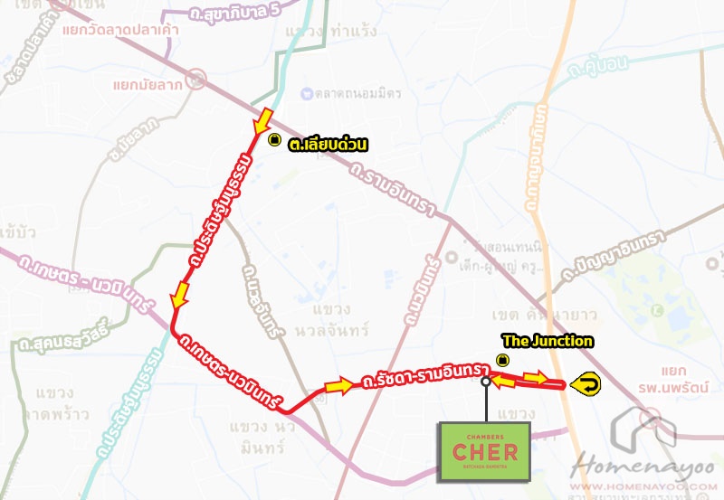 วันนี้ทางทีมงาน Homenayoo มีภาพการเดินทางไปสู่ตัวโครงการ แชมเบอร์ส เฌอ รัชดา – รามอินทรา โดยใช้รถยนต์ส่วนตัวมาฝากกันค่ะ โดยเราจะเริ่มการเดินทางจาก