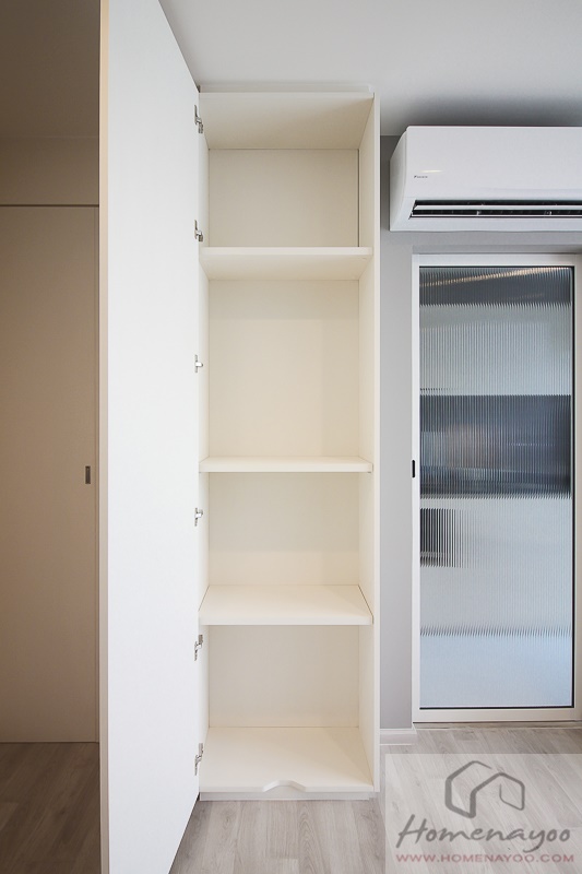 ที่ฝั่งขวาของห้องใกล้ทางประตูเข้า – ออกจะมีตู้เสื้อผ้าแบบ Built – in มาให้ขนาดไม่เล็กไม่ใหญ่กว้างประมาณ 0.8 เมตร ข้างบนก็ยังสามารถวางของเพิ่มได้อีกนะ