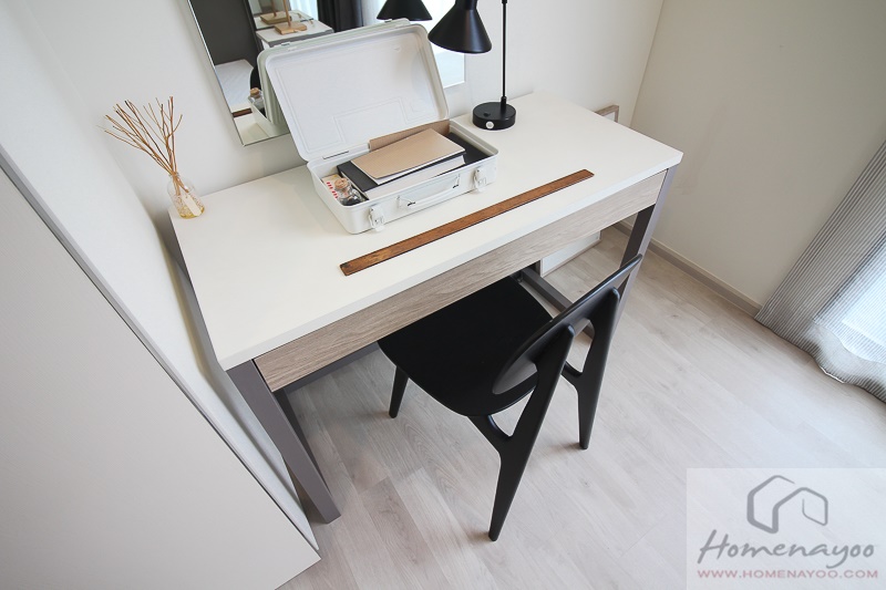 ชุดโต๊ะเครื่องแป้ง และเก้าอี้ที่ได้มาด้วย ยังเหลือพื้นที่ข้างๆ อีกหน่อย อาจจะหาชั้นเล็กๆ มาวางเป็นชั้นเก็บของหรือชั้นวางหนังสือก็ได้