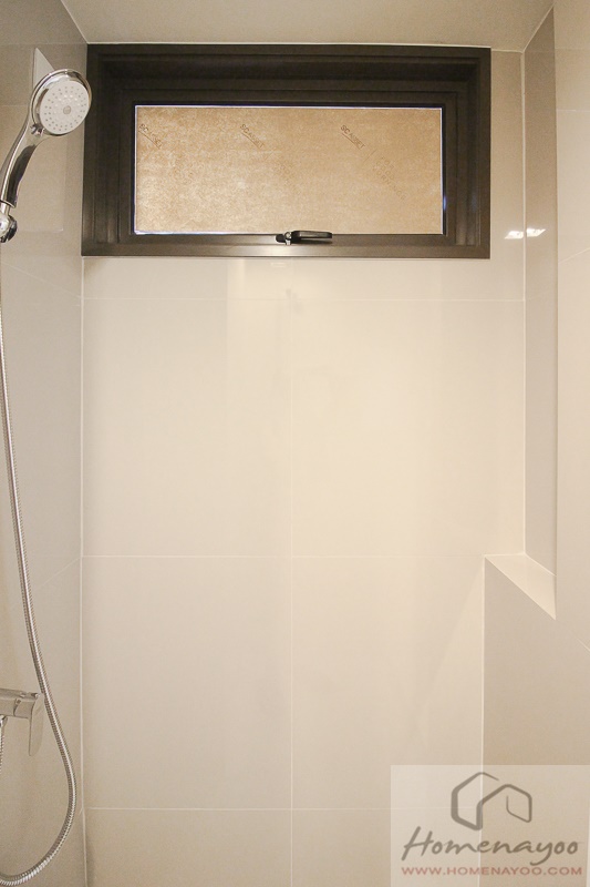 ฝั่งตรงข้ามกับฝักบัว เจาะผนังทำชั้นวางสบู่ให้เรียบร้อย ข้อดีของห้องน้ำห้องนี้ก็คือ มีหน้าต่างระบายอากาศมาให้ด้วย