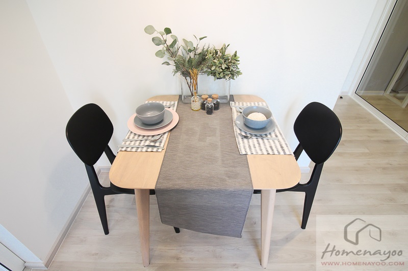 มาดูที่ส่วนของห้องรับประทานอาหารกันก่อน ตรงนี้จะเป็นมุมผนังเข้าไปสามารถวางโต๊ะกินข้าวขนาด 2 ที่นั่งได้พอดีๆ แต่ถ้ามี 3 คน เราก็สามารถต่อเก้าอี้เพิ่มได้อีก 1 ตัว และอาจจะทำโต๊ะให้มีส่วนที่สามารถพับเก็บได้เพิ่มเติม