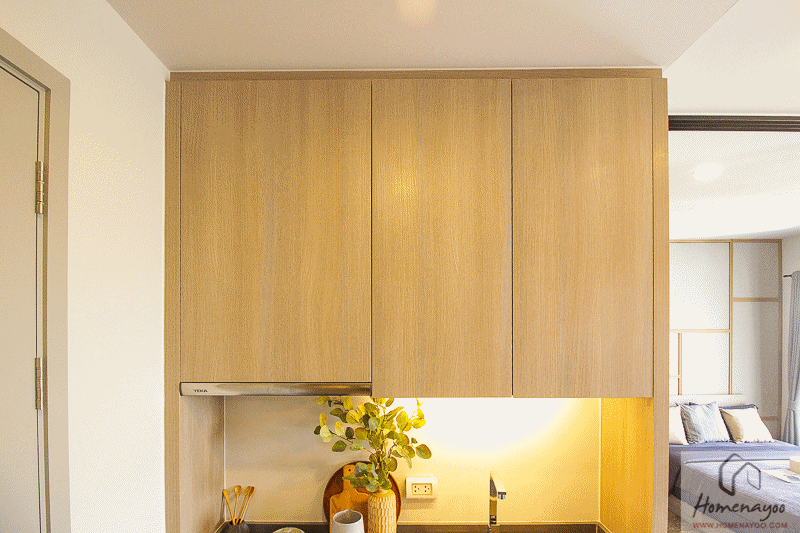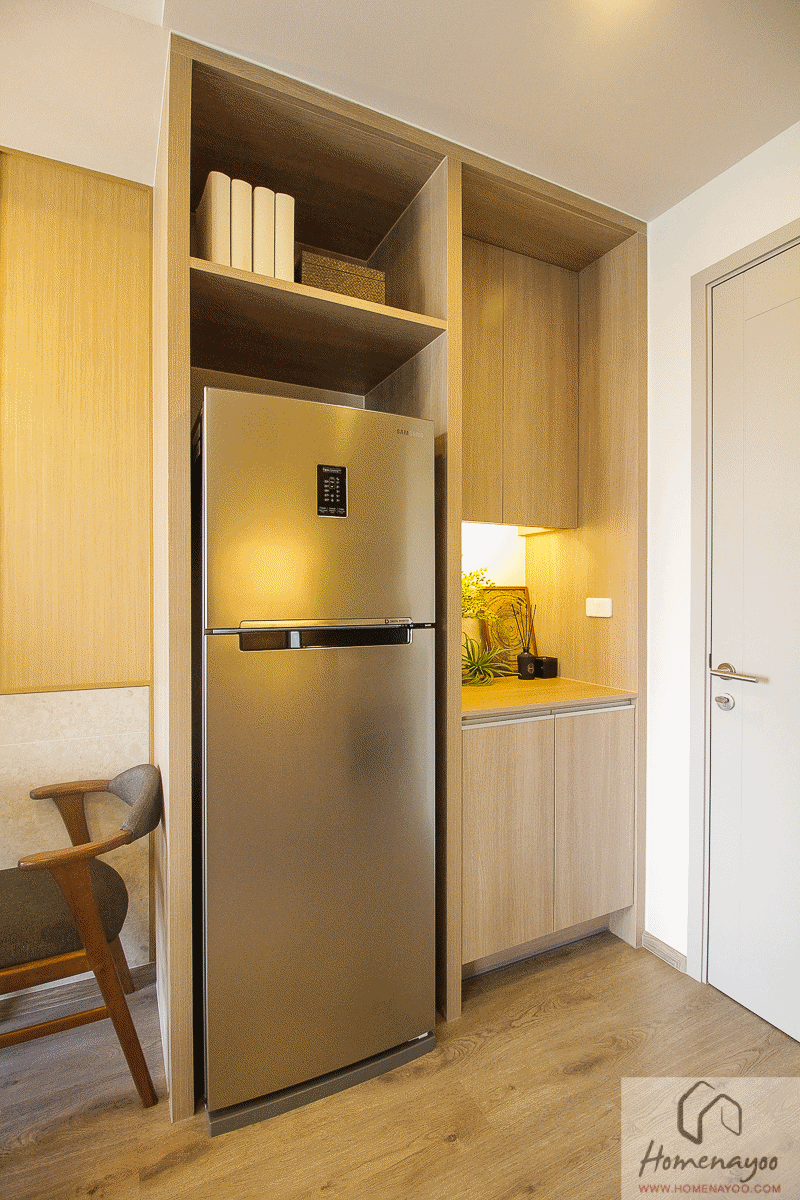 พื้นที่ส่วนแรกของห้องจะเป็นครัวเปิด เหมาะกับคนที่ไม่ได้ทำอาหารจริงจังมากนัก เน้นเป็นการเตรียมอาหารเล็ก ๆ น้อย ๆ หรือซื้อเข้ามาทานค่ะ โดยตู้ในส่วนแรกจะแบ่ง Built-in ชั้นวางของและเคาน์เตอร์ครั้วให้เป็น 2 ฝั่ง