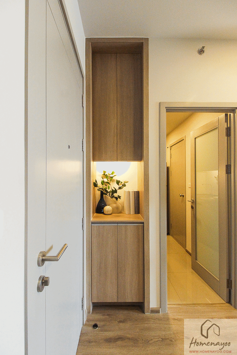 อีกด้านจะมีชุดตู้วางรองเท้าและของกระจุกกระจิกที่ช่วยให้ห้องเป็นระเบียบมากขึ้น นอกจากนั้นก็จะมีช่องสำหรับวางตู้เย็นที่ทำมาให้ห้องดูเรียบร้อยขึ้นด้วยค่ะ