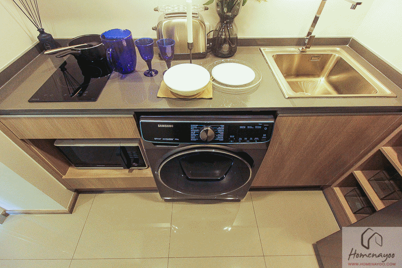 เคาน์เตอร์ครัวถือว่ามีพื้นที่ให้ใช้เตรียมอาหารกว้างพอสมควรเลยนะ และห้องนี้ยังเตรียมพื้นที่ติดตั้งเครื่องซักผ้ามาให้ในห้องแล้วด้วย ไม่ต้องเอาไปวางตรงระเบียงค่ะ
