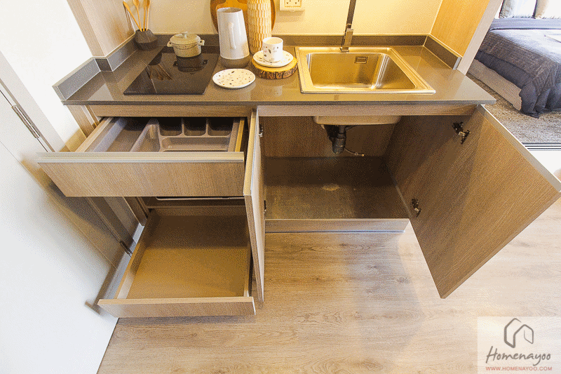 ด้านล่างแบ่งเป็นลิ้นชักพร้อมช่องแบ่งวางช้อน/ส้อม และตู้เก็บของใต้อ่าง