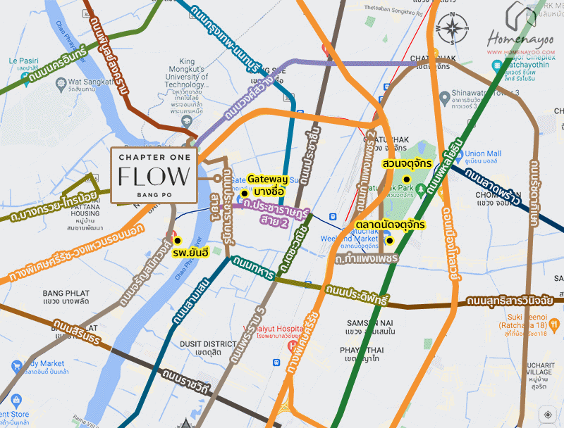 ทำเลที่ตั้งโครงการ : โครงการ Chapter One Flow บางโพ ตั้งอยู่บน ถนนประชาราษฎร์ สาย 1 เป็นทำเลย่านบางโพ ใกล้นนทบุรี ที่เป็นพื้นที่ติดฝั่งแม่น้ำเจ้าพระยา มีบรรยากาศการอยู่อาศัยที่มีความเป็นชุมชนเก่าดั้งเดิม ก็คือจะเป็นบรรยากาศของชุมชนคนจีนที่นิยมค้าขายไม้มาตั้งแต่สมัยก่อน มีความคึกคักเพราะมีคนอยู่อาศัยเยอะ