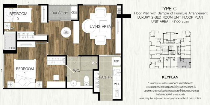| ลักษณะห้องและขนาดห้อง | 1 Bedroom / 25 – 41 ตร.ม. 2 Bedroom / 47 – 52 ตร.ม. |