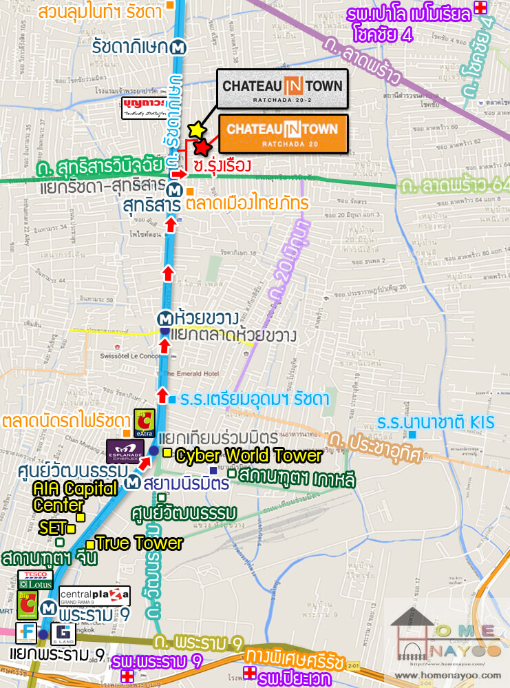 Chateau In Town รัชดา 20-2 จาก เจ้าพระยามหานคร ตั้งอยู่บนซอยรัชดาภิเษก 20 (ซอยรุ่งเรือง) ถนนรัชดาภิเษก เขตห้วยขวาง กทม. ใกล้รถไฟฟ้า MRT สุทธิสาร ประมาณ 240 เมตร, เซ็นทรัล พระราม 9, ฟอร์จูน พระราม 9, บิ๊กซี เอ็กซ์ตร้า, The Street รัชดา, เอสพลานาด รัชดา และ รพ.พระราม 9