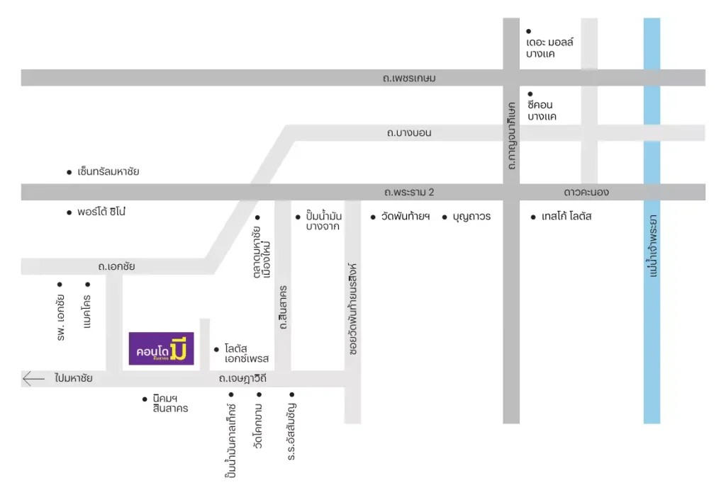 ทางคู่ขนาน ถนนพระราม 2 ⇒ ถนนสินสาคร (2032) ⇒ ถนนเจษฎาวิถี ⇒ 1.1 กม.* ⇒ ถึงโครงการ condo me สินสาคร