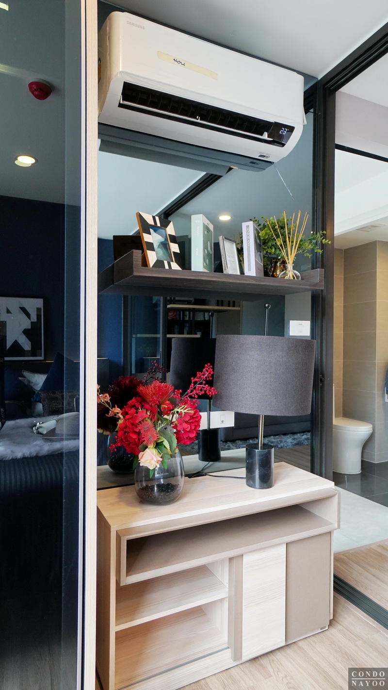 ตรงข้ามกันจะได้ชั้นวางทีวี พร้อมชั้นวางของ หน้าโต๊ะรองรับทีวีขนาด 32-42 นิ้วได้กำลังพอดี ผนังด้านหลังเดินงานระบบไฟฟ้ามาให้พร้อมต่อใช้งาน และที่ผนังด้านบนจะติดแอร์ Wall Type มาให้กับห้อง 1 เครื่อง