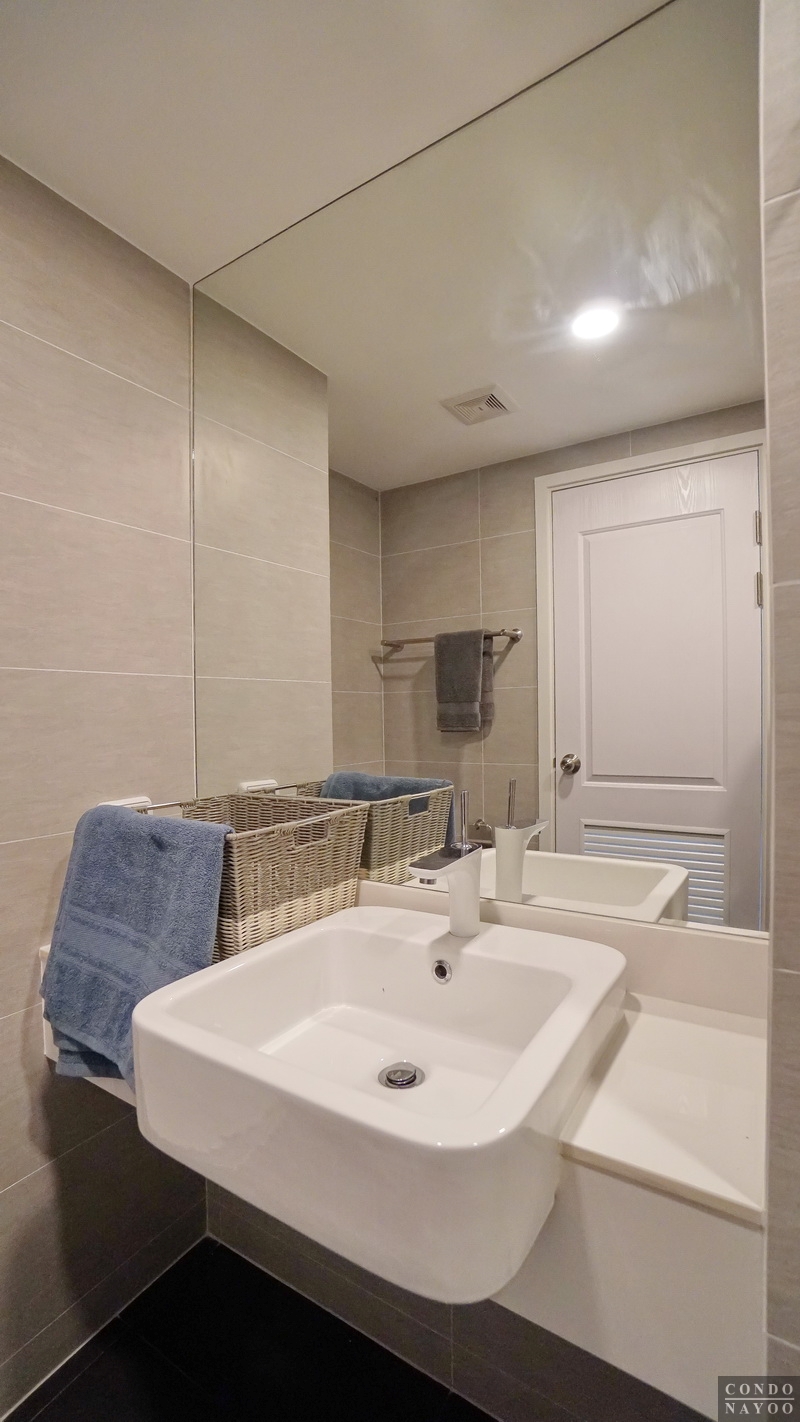 ห้องน้ำแบ่งส่วนแห้ง แยกส่วนเปียกมาให้เรียบร้อย ภายในตกแต่งกระเบื้องแผ่นใหญ่ในโทนสีเทาและสีเบจ มีตัวช่วยในการระบายอากาศเป็นพัดลมแบบฝังฝ้า 1 เครื่อง