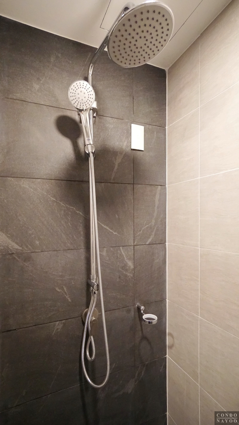 ด้านในติดฝักบัวมาให้ 2 รูปแบบเลย ทั้ง Hand Shower และ Rain Shower ผนังมีที่วางสบู่ และเตรียมงานระบบไฟฟ้า ติด Junction Box รองรับการต่อเครื่องทำน้ำอุ่นได้อย่างปลอดภัยค่ะ