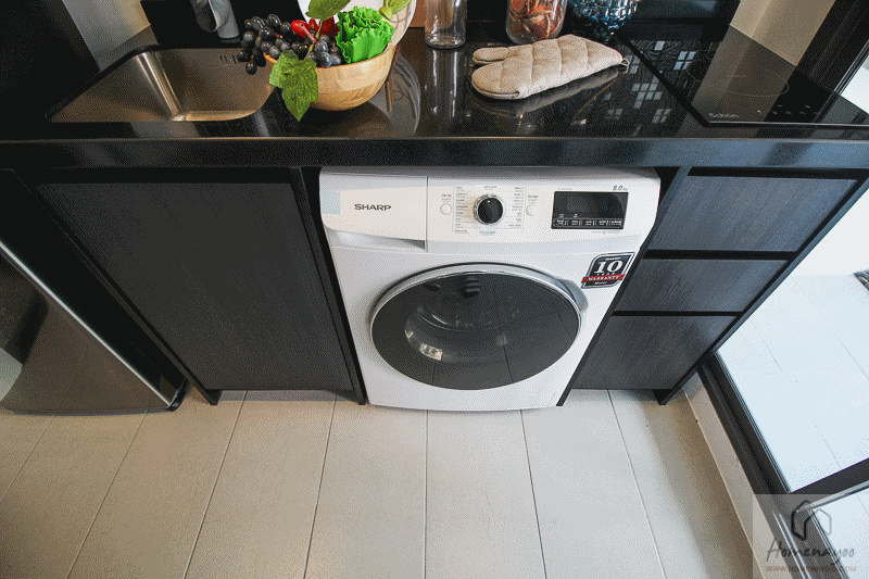 ด้านล่างตรงกลางจะเป็นพื้นที่วางเครื่องซักผ้าฝาหน้า ขนาดประมาณ 7 กก. ที่ด้านหลังเตรียมระบบน้ำ-ไฟมาให้พร้อมต่อใช้งาน