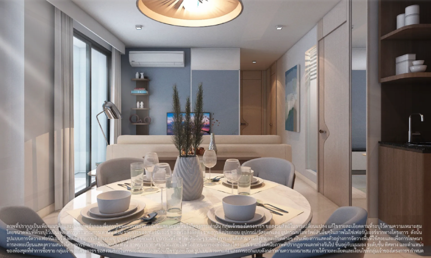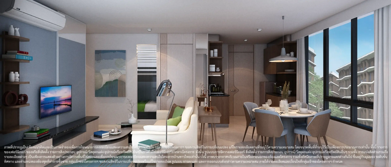ภาพและบรรยากาศจำลองภายในห้องนั่งเล่น มุมทานอาหาร และมุมครัว ของห้องพักแบบ 3 ห้องนอน 60.00 ตร.ม.