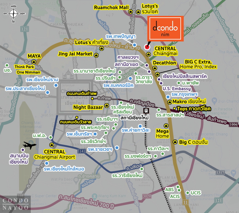 dcondo Nim เชียงใหม่ โครงการจาก บริษัท แสนสิริ จำกัด (มหาชน) ตั้งอยู่ติดทางคู่ขนานถนนซูเปอร์ไฮเวย์ ใกล้เซ็นทรัล เฟสติวัล เชียงใหม่, บิ๊กซี, โฮมโปร, รร.เทพปัญญา และ ม.พายัพ