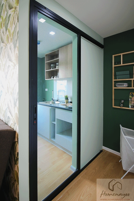 จากห้องครัวจะเชื่อมต่อไปยังระเบียงห้อง ด้วยประตูบานเลื่อนเปิด 3 ตอนแบบนี้