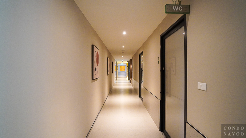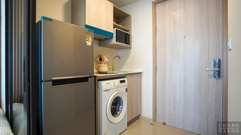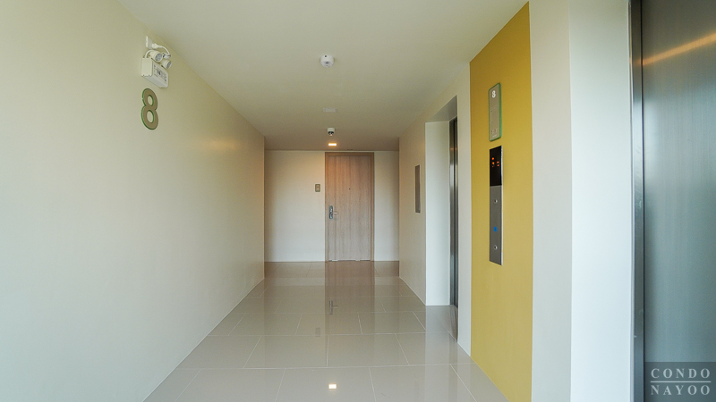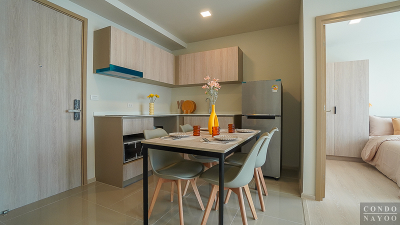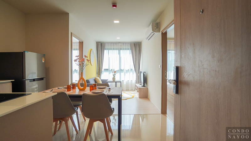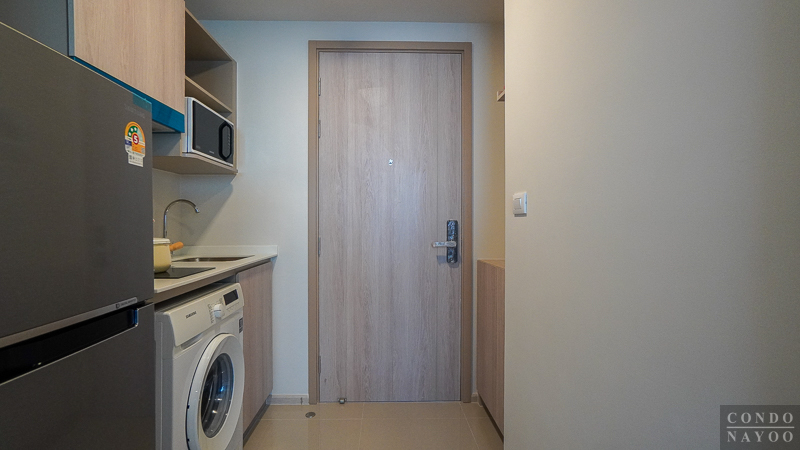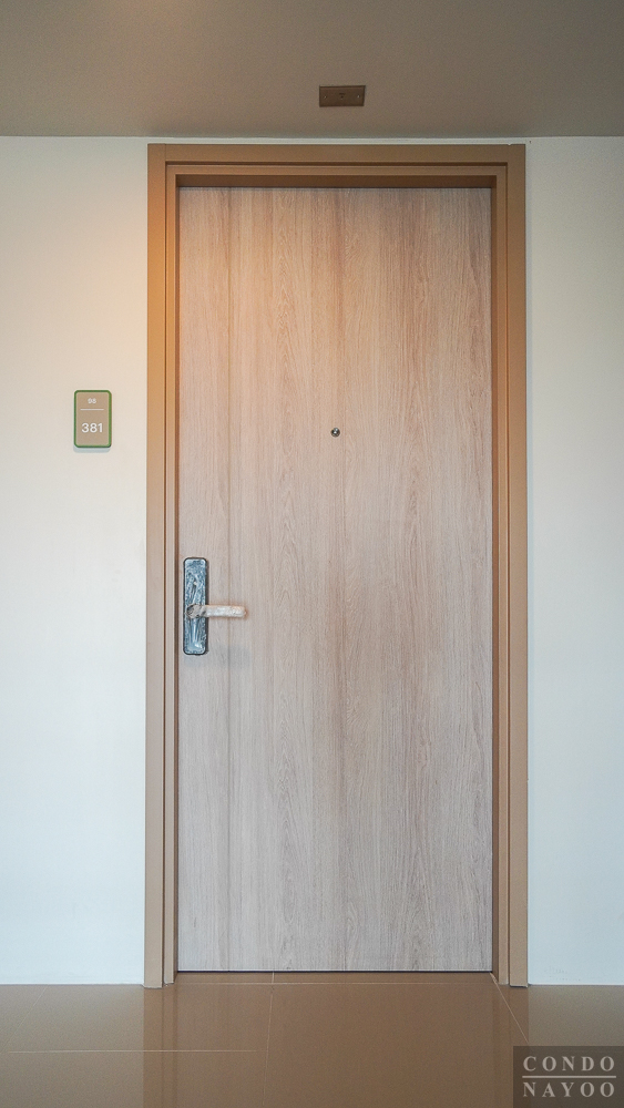 ประตูห้องพักได้กลอน Digital Door Lock เหมือนกันทุกยูนิต เปิดประตูเข้ามาจะเจอกับครัวเปิด มุมทานอาหาร และห้องนั่งเล่นแบบในภาพ ความสูงฝ้าเพดาน 2.5 ม. ผนังและฝ้าฉาบเรียบทาสี แลละได้โคมไฟแบบ Led Panel ทั้งห้อง