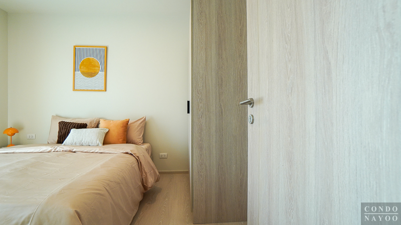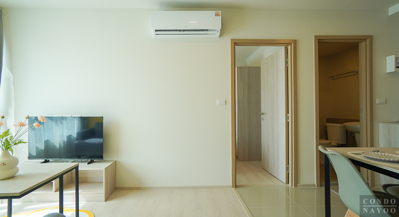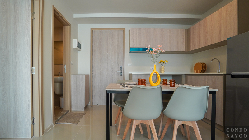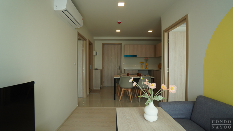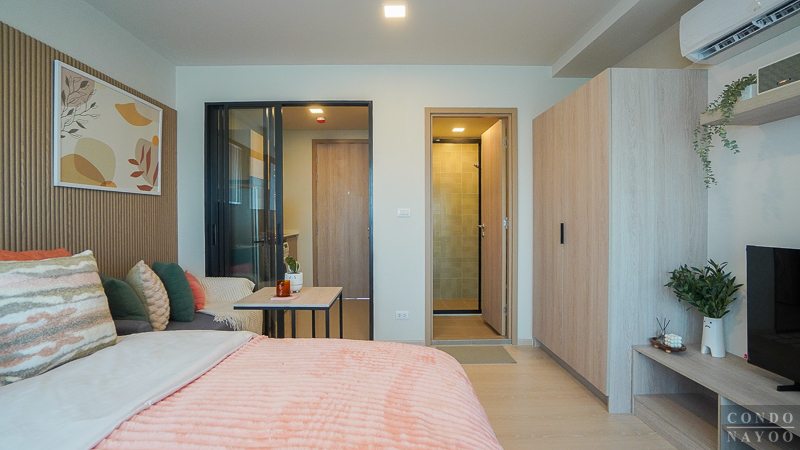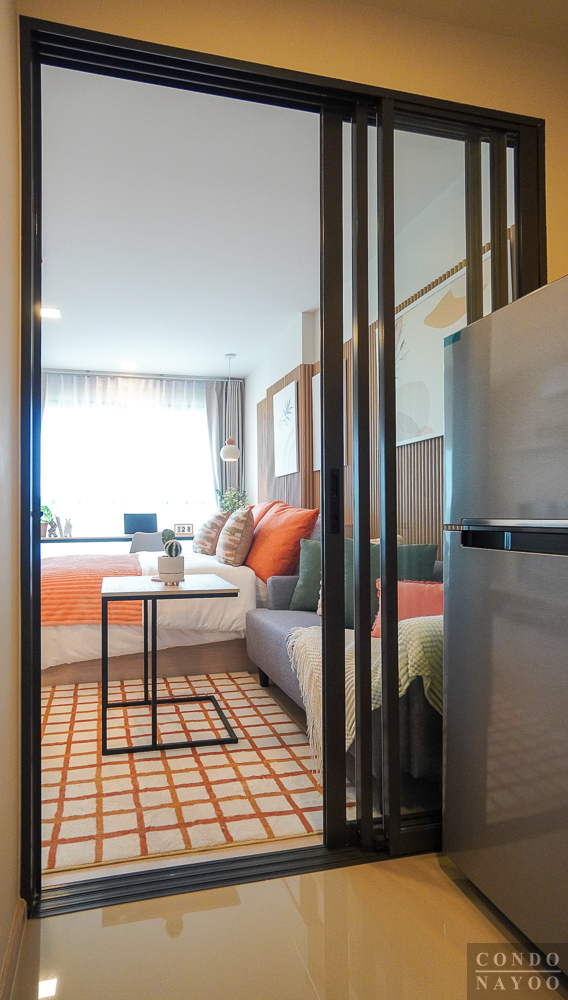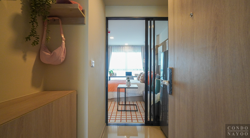 เมื่อเปิดประตูเข้ามาจะเจอครัวเปิดและมุมทานอาหารอยู่ด้านหน้า ต่อเนื่องไปยังห้องนั่งเล่นติดหน้าต่างที่รับแสงธรรมชาติได้ดี ด้านซ้ายเป็นห้องนอนใหญ่พร้อมห้องน้ำในตัวเพิ่มความสะดวกสำหรับผู้พักอาศัยหลัก