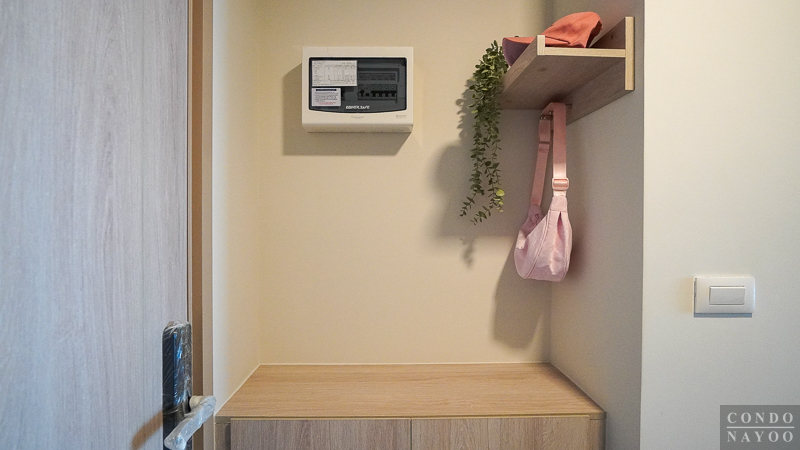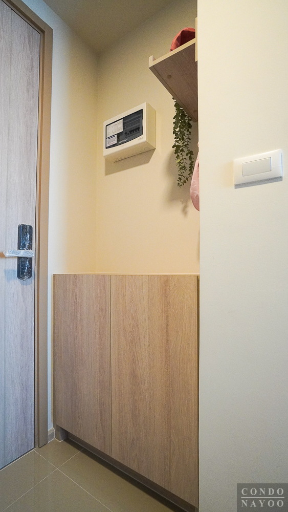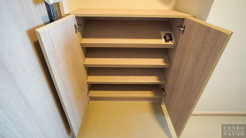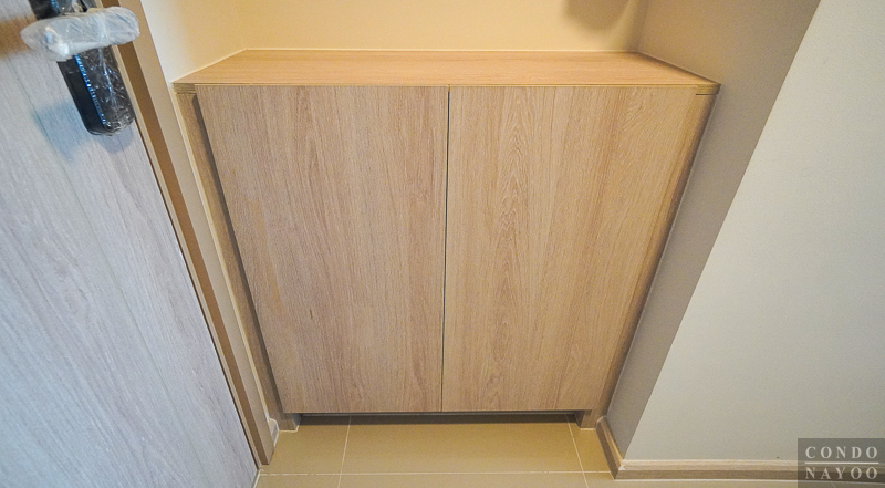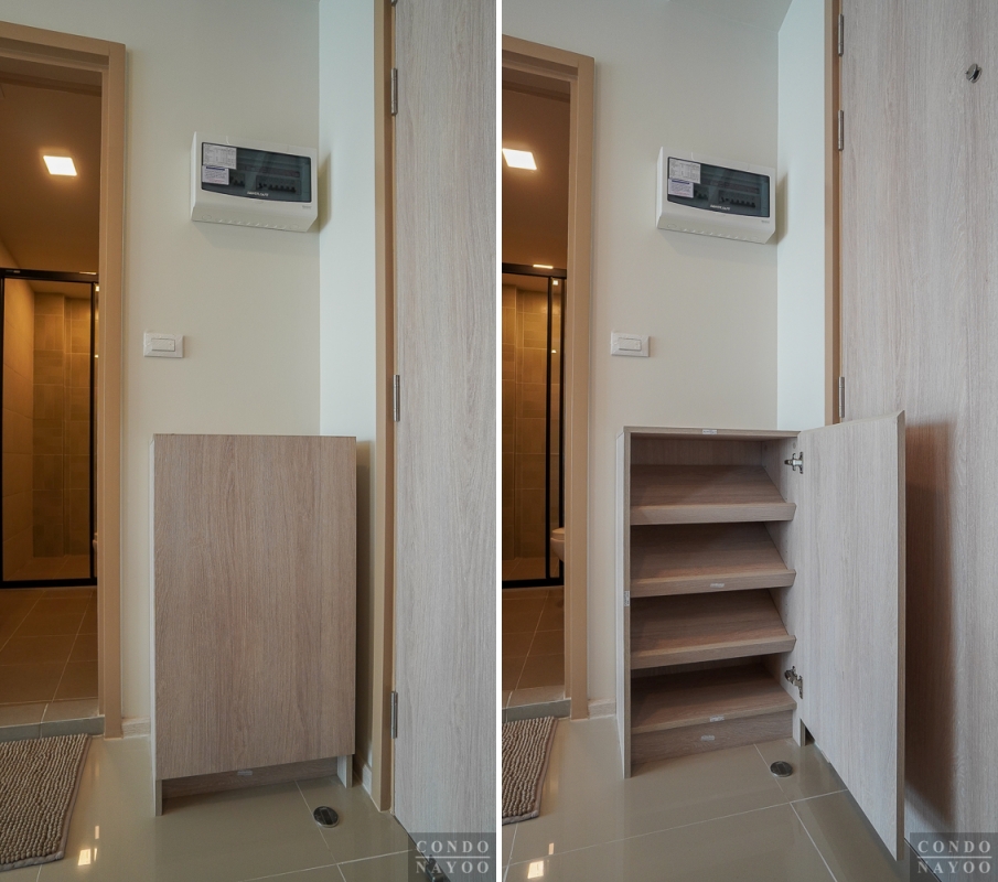 ด้านหน้าห้องน้ำ จะได้ตู้เก็บรองเท้าบานเปิด 1 ตู้ ภายในมีชั้นลาดเอียงให้เก็บรองเท้าได้ 8 คู่