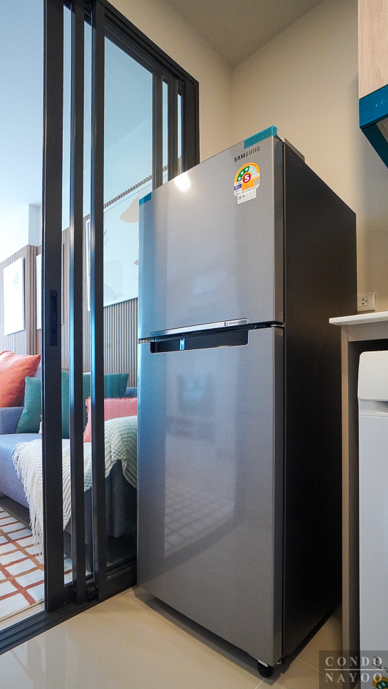 ห้องครัวจะกั้นแยกส่วนด้วยประตูกระจกบานเลื่อน 3 ตอน กรอบอะลูมิเนียมสีดำ ความสูงจรดฝ้าเพดาน ทำให้ห้องดูไม่อึดอัด และรับแสงธรรมชาติจากประตูระเบียงและหน้าต่างในห้องนอนมาส่วนครัวได้