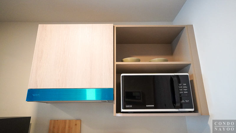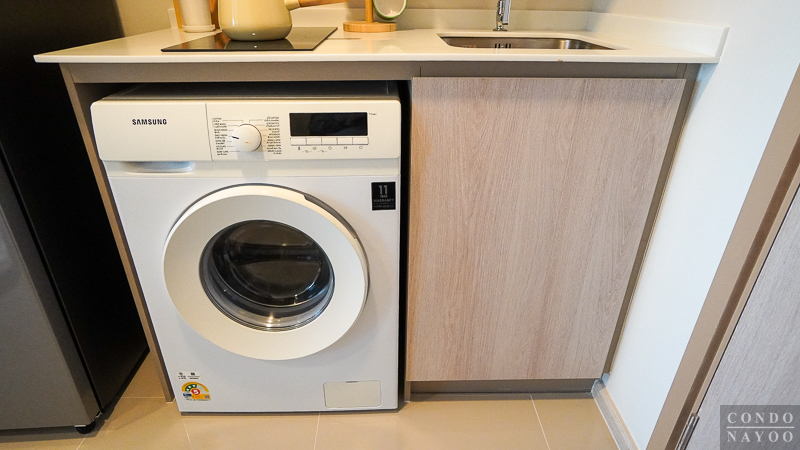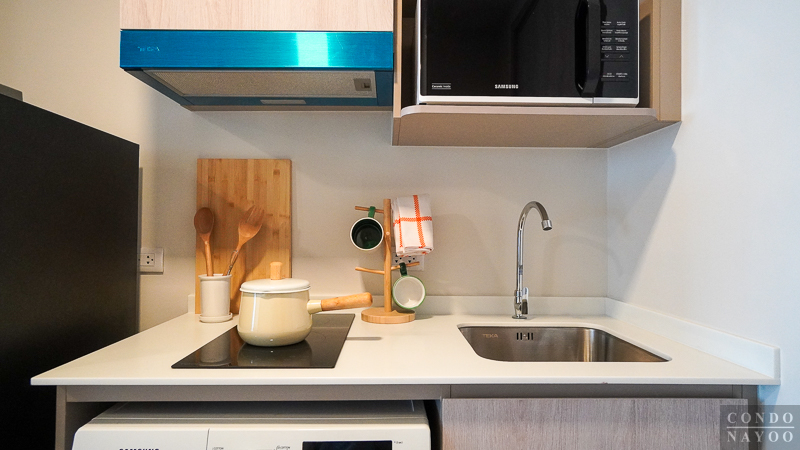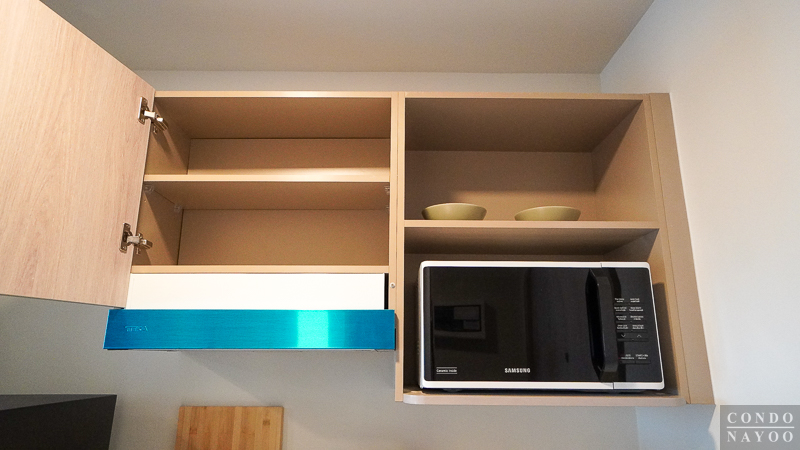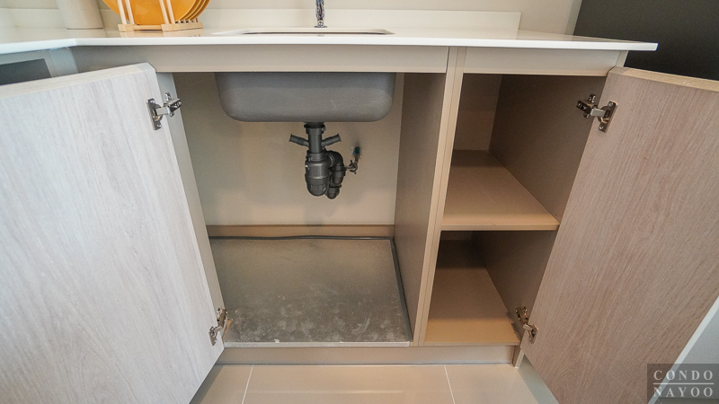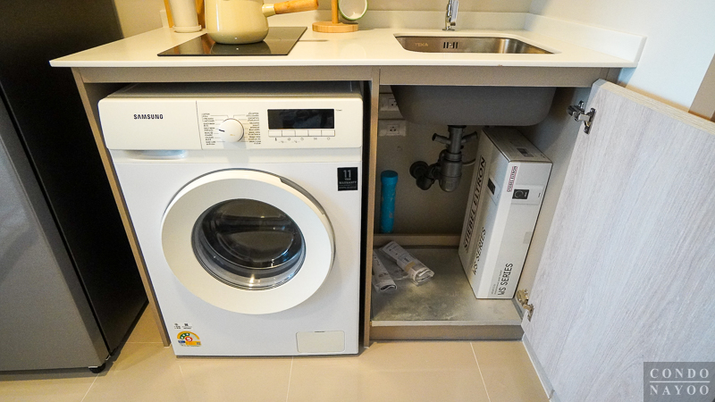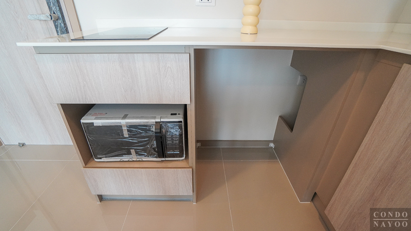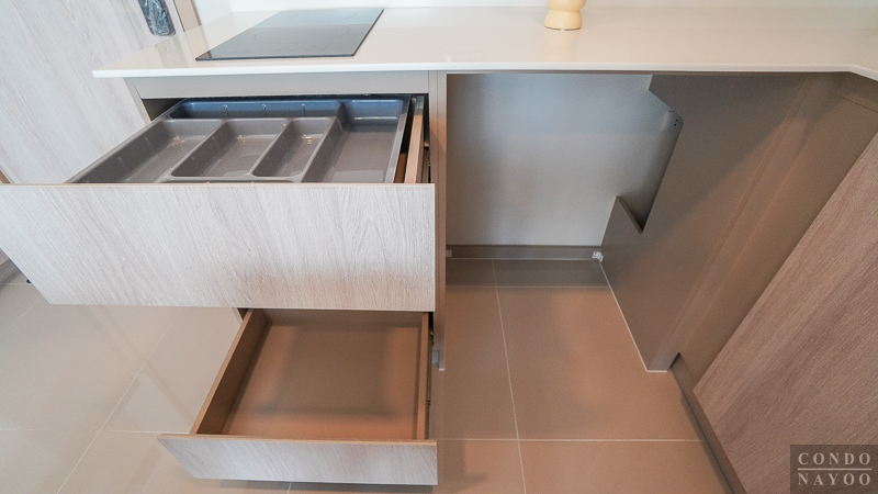 ส่วนด้านล่างจะมีตู้เก็บของ ลิ้นชักเก็บของ ถาดใส่ช้อนส้อม ช่องวางไมโครเวฟ และช่องวางเครื่องซักผ้าฝาหน้าที่เดินงานระบบน้ำ-ไฟมาให้พร้อมต่อใช้งานแบบนี้