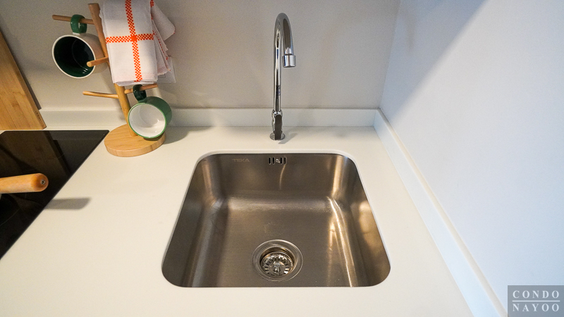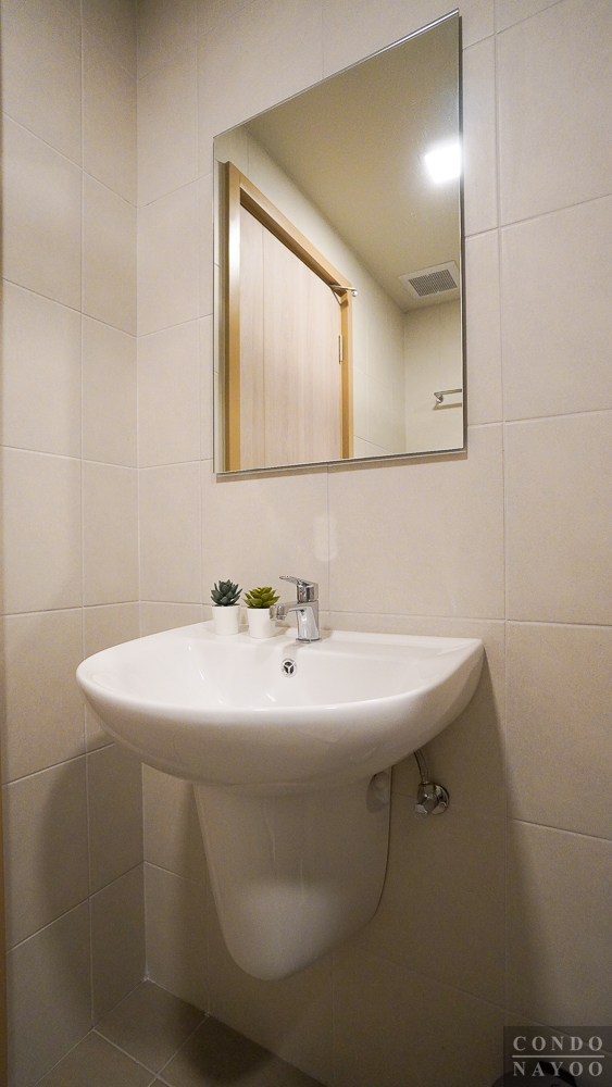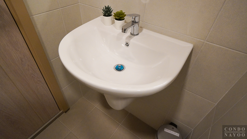 ได้อ่างทรงมรแบบแขวนผนัง หน้าอ่างวางใช้ได้เล็กน้อย ก๊อกน้ำได้เป็นแบบก้านโยก เปิด-ปิดใช้งานสะดวก และที่ใต้อ่างจะมีพื้นที่เหลือให้วางถังขยะ ชั้นวางของเล็ก ๆ หรือต้นไม้ฟอกอากาศเพิ่มเข้าไปได้