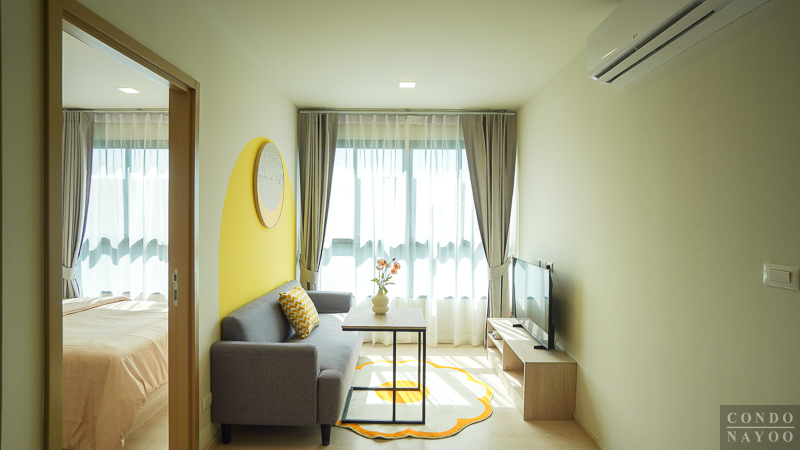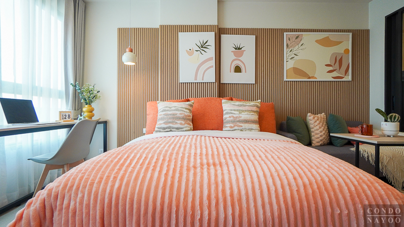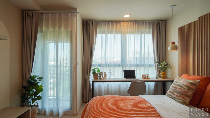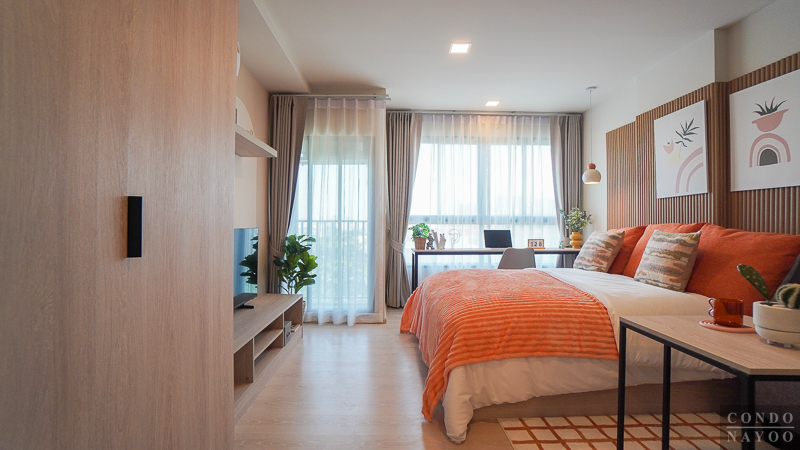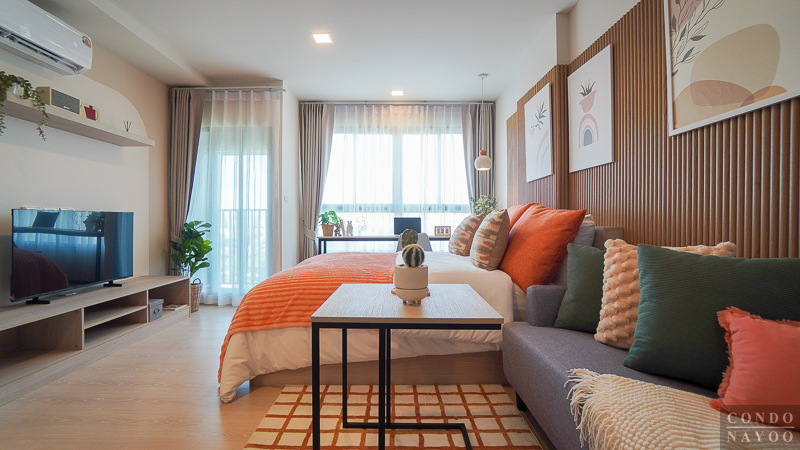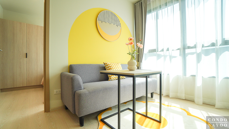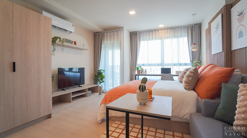 ภายในห้องจะได้เฟอร์นิเจอร์ลอยตัวและเฟอร์นิเจอร์ Built-in มาครบแล้วนะคะ โดยซ้ายมือจะได้เป็นตู้เสื้อผ้าและโต๊ะเคาน์เตอร์ชิดผนัง ขวามือจะเป็นโซฟา โต๊ะกาแฟ ฐานเตียงนอน 5 ฟุต และมีโต๊ะทำงานตัวยาวชิดริมหน้าต่าง พร้อมติดแอร์ Wall Type มาให้เรียบร้อยเลยค่ะ