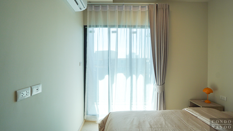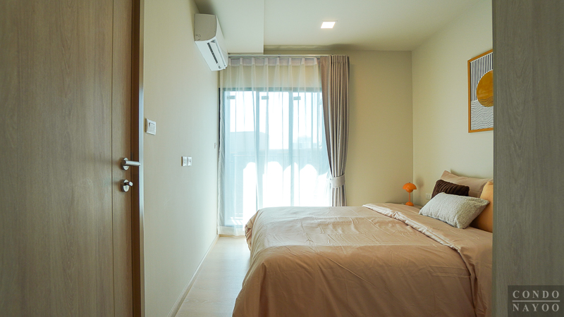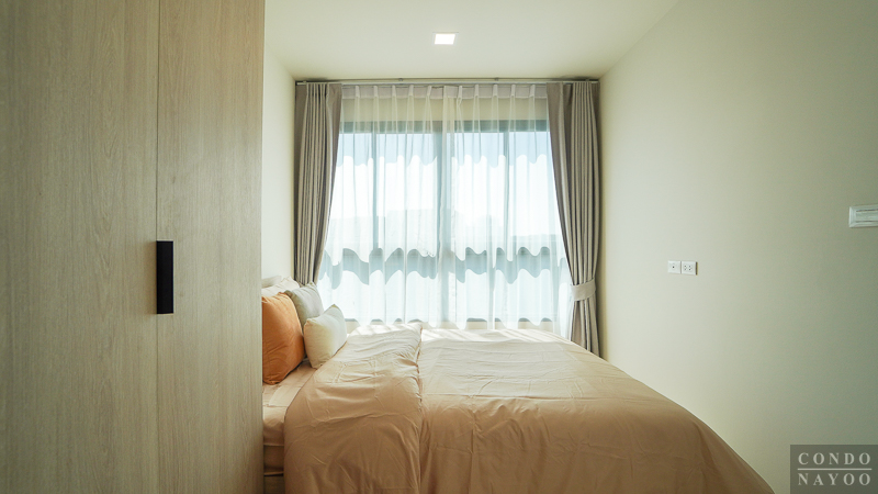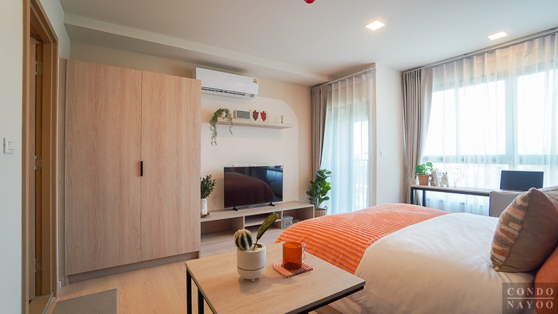 ปลายเตียงนอนเป็นผนังเปล่าโล่ง ๆ ที่มีงานระบบไฟฟ้าติดตั้งให้ สามารถซื้อ Smart TV มาติดเพิ่มได้เอง และผนังด้านบนจะติดแอร์ Wall Type มาให้แล้ว 1 เครื่องค่ะ
