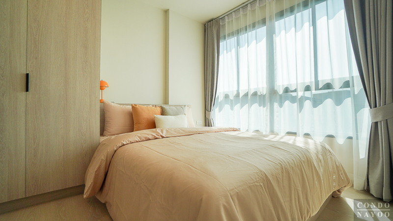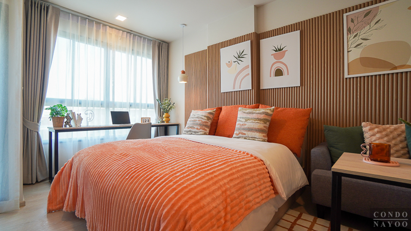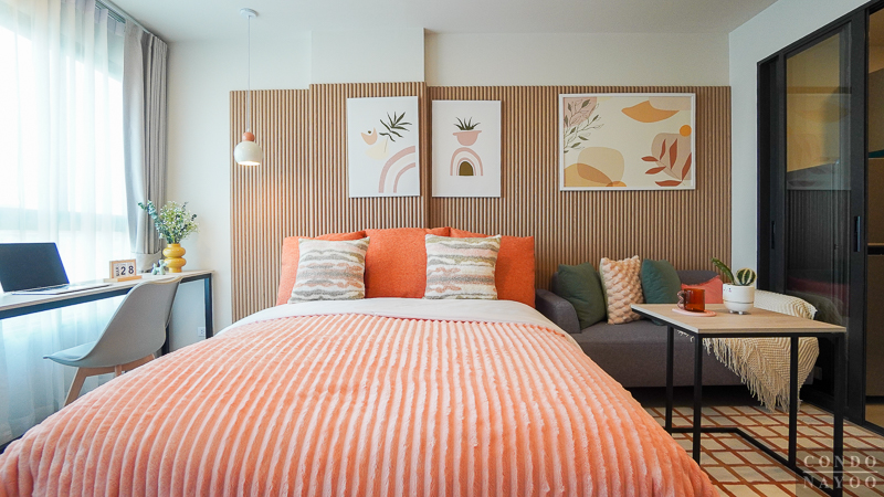 ตัวอาคารออกแบบมาในสไตล์โมเดิร์น ใช้โทนสีเทาและสีส้มทำให้ดีไซน์มีความโดดเด่นเฉพาะตัว ห้องพักออกแบบให้เป็นสัดส่วน ใช้งานได้จริง มีห้องพักให้เลือก 4 Type หลัก ทั้งแบบ 1 Bedroom, 1 Bedroom Plus และ 2 Bedrooms พื้นที่ใช้สอยเริ่มต้น 24.50-45.50 ตร.ม.