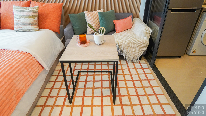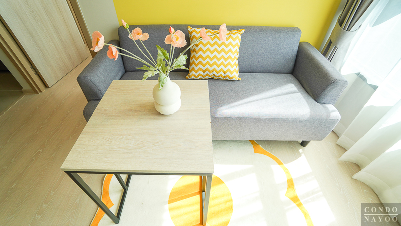ตรงมุมนั่งเล่นจะได้โซฟาผ้าสีเทาขนาด 2 ที่นั่ง พร้อมโต๊ะกาแฟ 1 ตัว โดยโต๊ะกาแฟที่แถมมาจะมีความสูงที่พอดี สามารถนั่งทานข้าวจากมุมนี้ได้สบาย ๆ เลยค่ะ