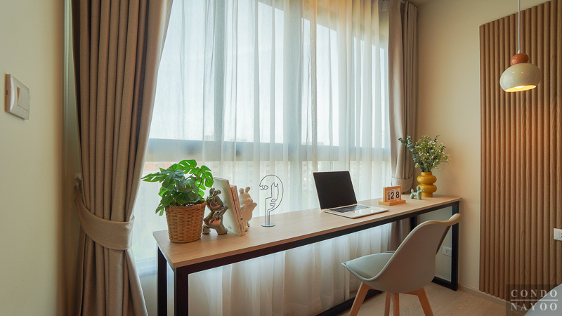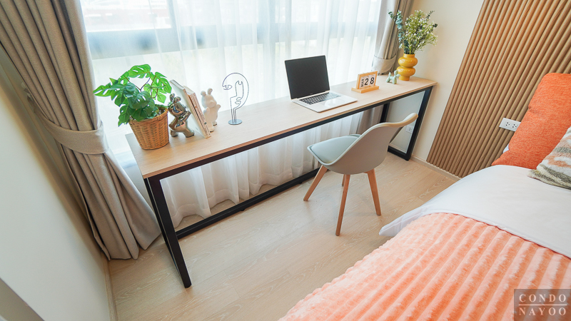 ริมหน้าต่างข้างเตียงนอน ได้โต๊ะทำงานตัวยาวมาแบบนี้ค่ะ สามารถนั่งทำงานพร้อม ๆ กัน 2 คนได้ และที่ผนังจะมีปลั๊กไฟไว้รองรับการเสียบชาร์จ Laptop หรือเครื่องใช้ไฟฟ้าต่าง ๆ ได้สะดวกมาก ๆ