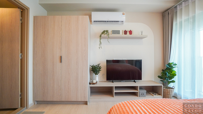 ปลายเตียงนอนจะได้ตู้เสื้อผ้า Built-in พร้อมชั้นวางทีวีขนาดใหญ่ ผนังด้านบนติดแอร์ Wall Type ให้มาตรฐาน 1 เครื่อง