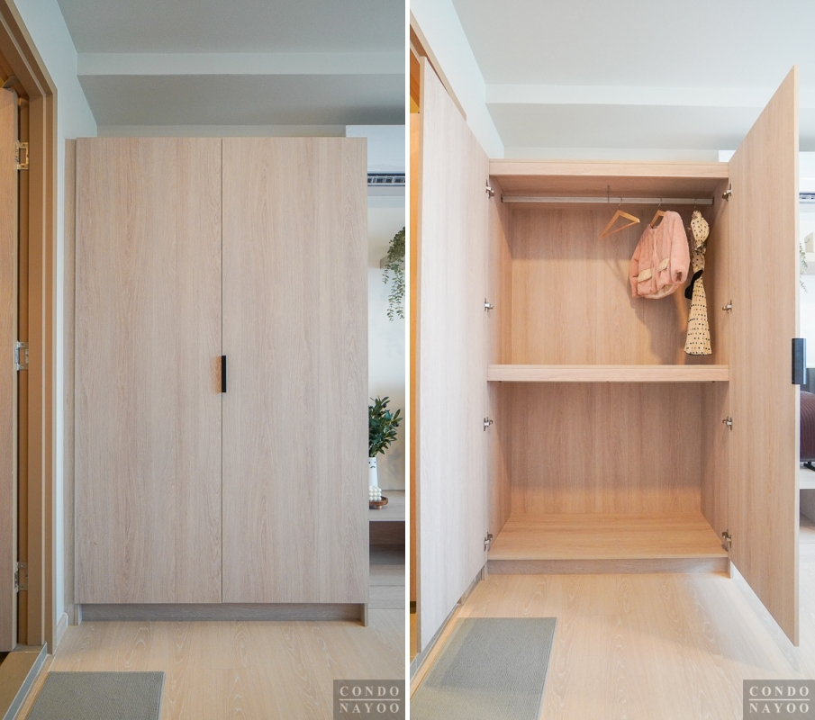 ติดกันได้ตู้เสื้อผ้า Built-in ลายไม้ ความสูงจรดฝ้าเพดาน ในรูปแบบ 2 บานเปิด ภายในมีครบทั้งราวแขวนเสื้อผ้า และราวแขวนกางเกง โดยในตู้นี้จะสามารถเก็บกระเป๋าเดินทางใบใหญ่ที่ด้านล่างได้สบาย ๆ