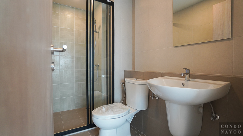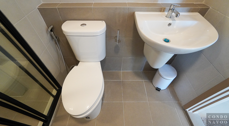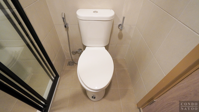 ส่วนห้องน้ำจะได้ฟังก์ชัน ยี่ห้อสุขภัณฑ์ และการตกแต่งกระเบื้องมาเหมือนกันกับห้องน้ำด้านนอกทุกประการเลยค่ะ