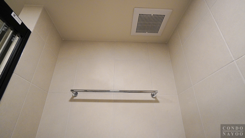 ผนังเหนือโถสุขภัณฑ์ติดราวแขวนผ้าสแตนเลสให้ 1 ชิ้น และที่เพดานด้านบนติดพัดลมระบายอากาศให้ 1 เครื่อง