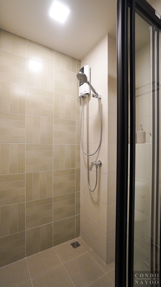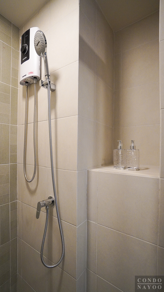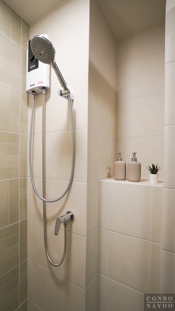 ภายในติดฝักบัว Hand Shower ก๊อกน้ำก้านโยกไว้ให้ ผนังติดตั้งเครื่องทำน้ำอุ่นให้เรียบร้อย และข้าง ๆ กันมีการเจาะช่องทำชั้นวางของให้ 1 ชั้น สามารถซื้อชั้นเล็ก ๆ แนวสูงมาวางเพิ่มได้