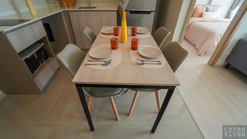 ติดกันจัดเป็นมุมทานอาหาร ได้ชุดโต๊ะทานข้าวขนาด 4 ที่นั่ง พร้อมเก้าอี้ โดยวางมาในระยะใช้งานได้สบาย ๆ