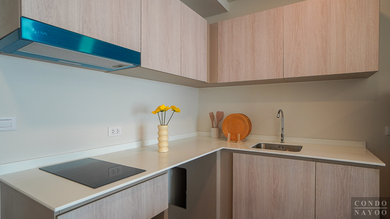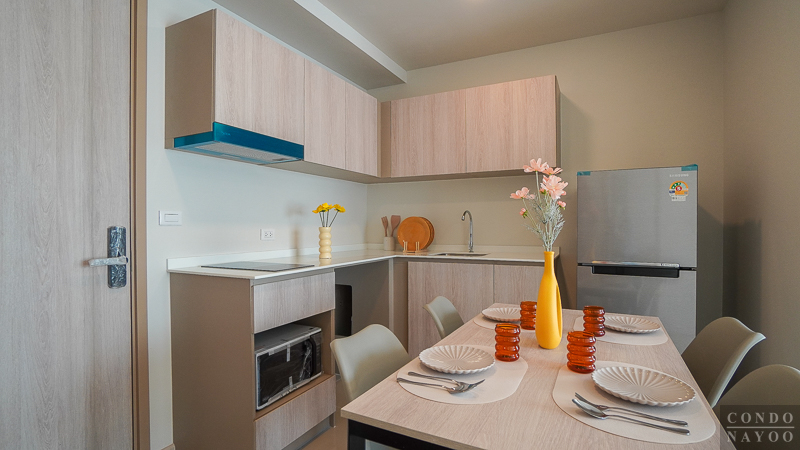 สำหรับห้องพักแบบ 2 ห้องนอน จะได้เคาน์เตอร์ครัวตัว L ขนาดใหญ่ พร้อมตู้เก็บของบนล่างครบชุด