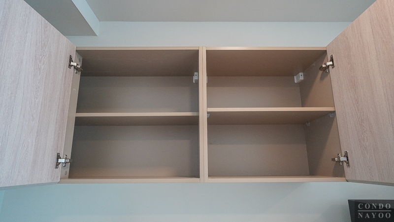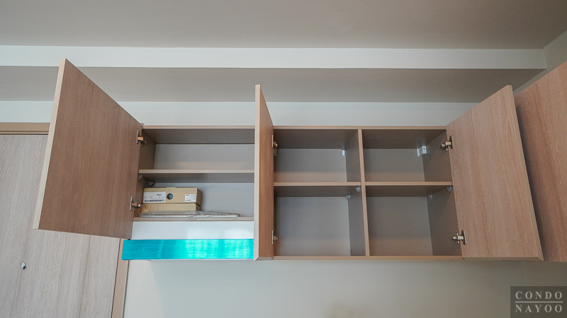 ด้านบนได้ตู้เก็บของมา 2 ด้าน ตัวตู้เป็นแบบบานเปิดลายไม้ พร้อมชั้นลอยภายในอีกหลายช่อง