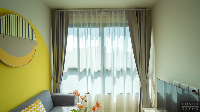 หน้าต่างในห้องจะเป็นกระจกบานผสมขนาดใหญ่ ด้านล่างจะเป็นบานฟิกซ์ไว้เพิ่มการรับแสงธรรมชาติ และด้านบนจะเป็นบานเลื่อนที่สามารถเปิดรับลม เปิดระบายอากาศได้