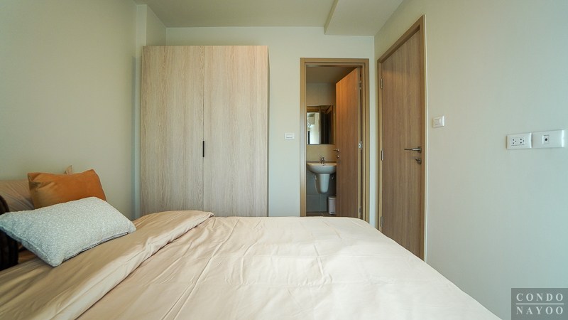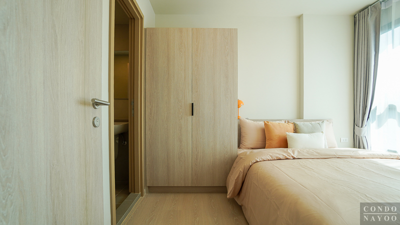 ห้องนอนใหญ่วาง Layout มาเป็นห้องหน้ากว้าง พร้อมฟังก์ชันห้องน้ำในตัวทำให้ใช้งานได้สะดวกสบายตลอด 24 ชม.